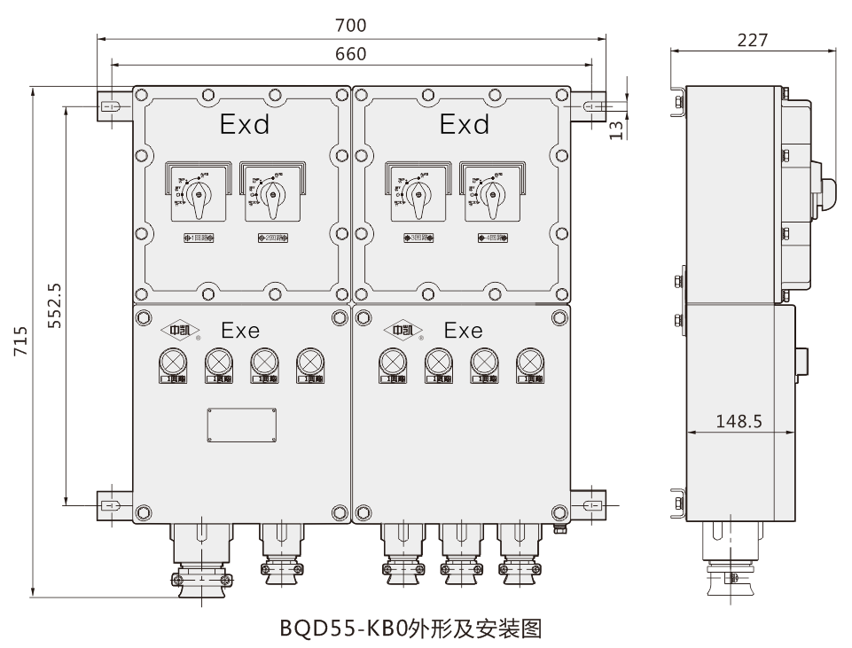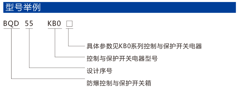 BQD55一KB0防爆控制與保護開關(guān)箱(以下簡稱開關(guān)箱)適用于ⅡB級T6組及以下級別、組別的爆炸性氣體混合物(1區(qū)和2區(qū))場所。主要用于交流50Hz(60Hz),額定電壓至400V,開關(guān)箱額定電流至180A,各分路的電流至45A的電路中,對配電電路負載的控制與保護及對電動機不頻繁或頻繁起動、停止的控制與保護。